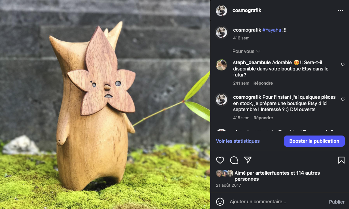 Je me suis dis qu'en faire un exercice de sculpture en bois serait une bonne idée, et j'ai pris comme modèle un des korogu que j'avais trouvé et me suis mis au boulot. Quelques jours après je poste le résultat sur mon instagram. la figurine est mal dimensionnée, un peu trop dodue mais il me plait beaucoup. Et à partir de là je reçois beaucoup de likes et commentaires, je suis même republié par un gros compte d'art toys, et beaucoup de gens se demandent où se procurer cette figurine qu'ils veulent acheter.