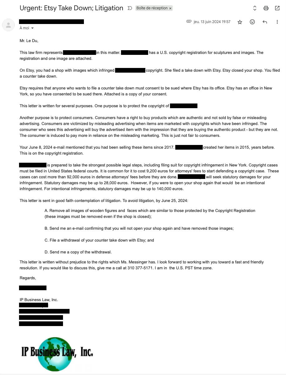Entre temps, après un an de fermeture de boutique à cause de la lettre d'avocat abusive, j'ai pris le temps de faire quelques recherches et je me suis rendu compte qu'il n'y avait aucune trace de ces figurines crées en 2015, et que l'avocat avait simplement exploité une faille de la déclaration de copyright US qui permet d'antidater la création d'un objet sans aucune preuve tangible. Je lui ai donc envoyé un email (resté sans réponse à ce jour) pour demander des preuves d'antériorité et j'ai réouvert ma boutique Etsy en attendant. On attends des nouvelles mais je pense que j'en aurais pas.