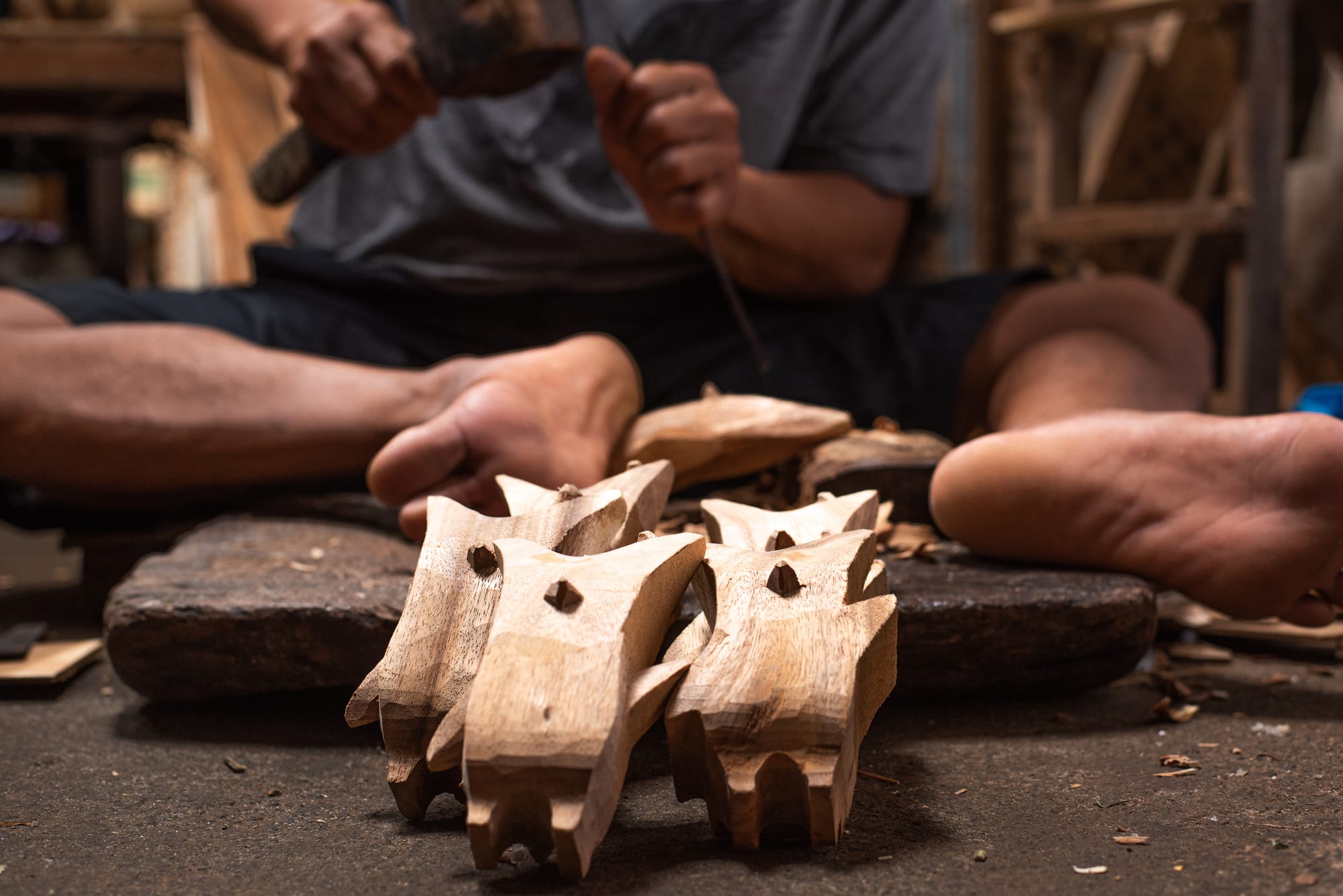 Je décide donc de lancer une production à Bali, et ralonge alors mon visa pour rester sur place quelques semaines de plus. Un jour, alors que je cherchais des fournisseurs pour le bois des masques de korogu, je rencontre Tunik dans une scierie qui se décidera de m'accompagner toute la journée pour m'aider à trouver des partenaires. Il m'apprend que dans sa famille il y a beaucoup de sculpteurs sur bois et qu'il serait ravi de m'aider avec mon business naissant. Je rencontre aussi Peduli Alam avec qui je noue un partenariat pour reverser une partie de mes bénéfices à leur association qui œuvre pour la préservation de la nature et qui met en place une collecte et une revalorisation des déchets plastique dans un village au nord de Bali appelé Amed.